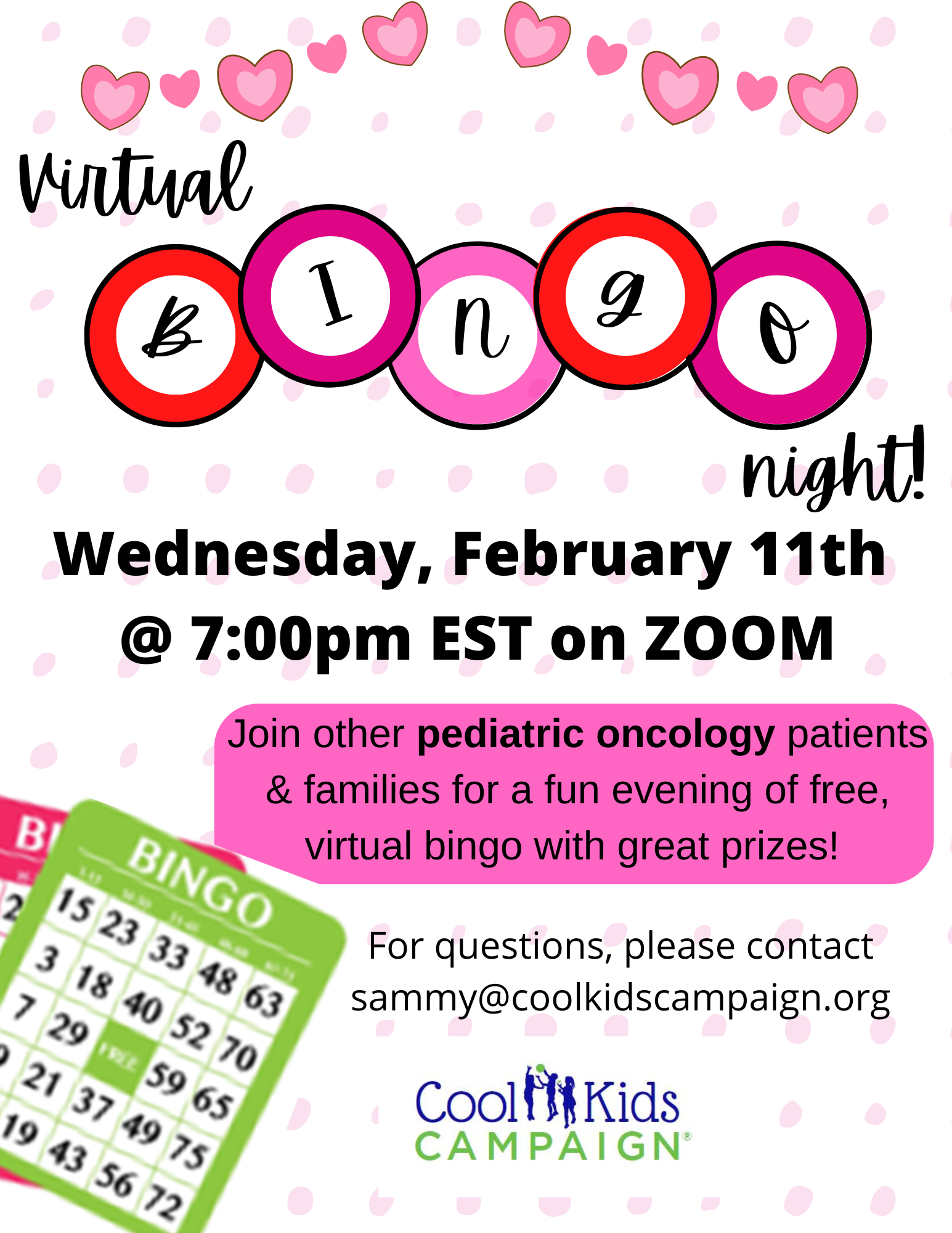 ***PLEASE NOTE: This is a private event for pediatric oncology patients/survivors and families only. If you found this event online, we apologize for the confusion. This is NOT a public event.*** Cool Kids Campaign is excited to announce its upcoming Virtual Family BINGO night! Wednesday, February 11th 7:00 - 8:00 PM [...]