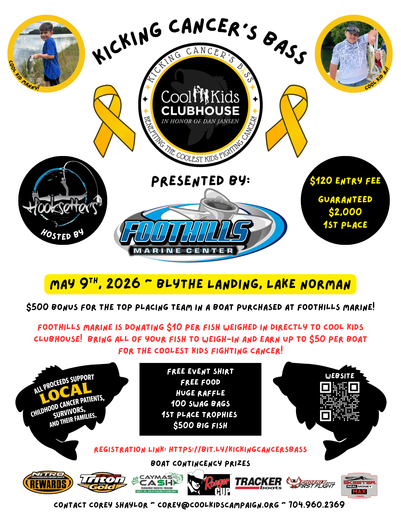 Blythe Landing 15901 NC 73 HY, 15901 NC-73, HuntersvilleRegistration is now open! Boat Registration: https://bit.ly/boatregistration Join us for our 2nd Annual Kicking Cancer's Bass Fishing Tournament presented by Foothills Marine! All new for 2026! 1. Foothills Marine is donating $10 per fish weighed in directly to Cool Kids Clubhouse! Earn up to $50 per boat for the Coolest Kids fighting [...]