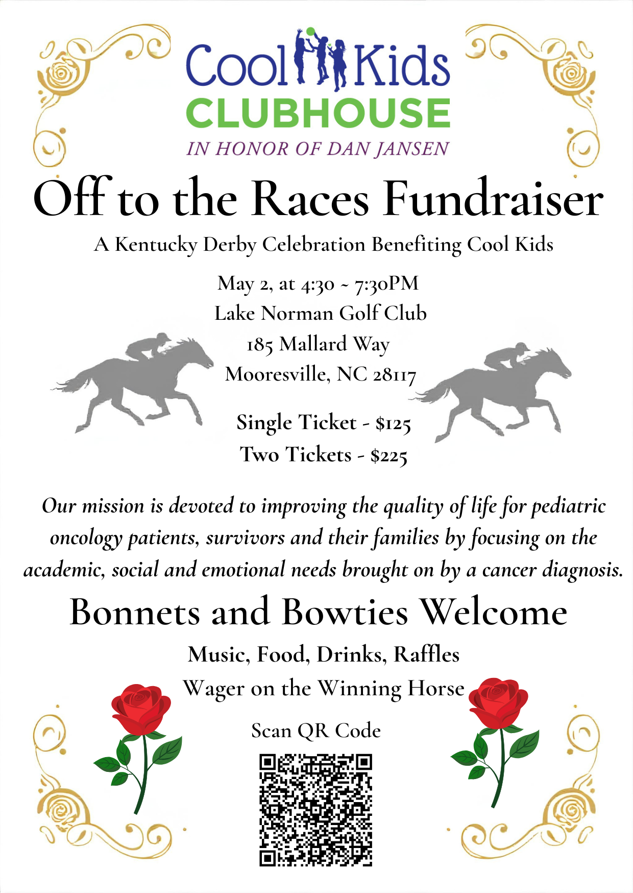 Lake Norman Golf Club 185 Mallard Way, Mooresville, NC, United StatesPut on your best Derby hat and join us at our first ever Off to the Races event! A Kentucky Derby–style benefit supporting Cool Kids Clubhouse and the children and families we serve across North and South Carolina. Seating is very limited so don't wait, grab your tickets here today! Purchase [...]